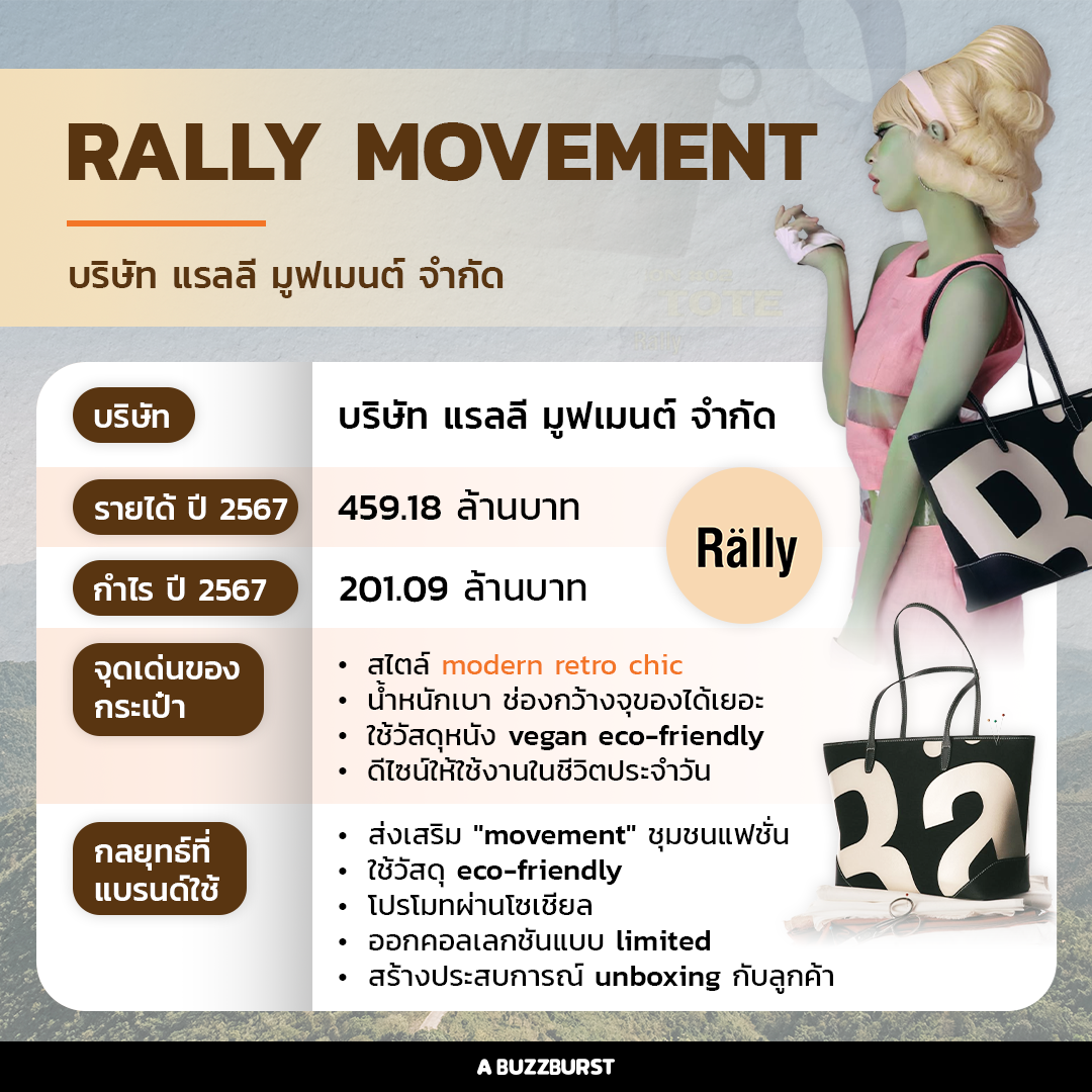 รายได้ทะลุ 459.18 ล้านบาท และกำไรสูงถึง 201.09 ล้านบาท Rally Movement ไม่ได้ขายแค่กระเป๋า แต่ขาย movement ที่ทำให้ลูกค้ารู้สึกเป็นส่วนหนึ่งของสังคมแฟชั่น ด้วยกระเป๋าสไตล์ modern retro chic ที่ทั้งเบา จุเยอะ และทำจาก vegan eco-friendly leather บวกกับกลยุทธ์ออกคอลเลกชันแบบ limited และการสร้างประสบการณ์ unboxing ที่ลูกค้ารู้สึกพิเศษทุกครั้ง
