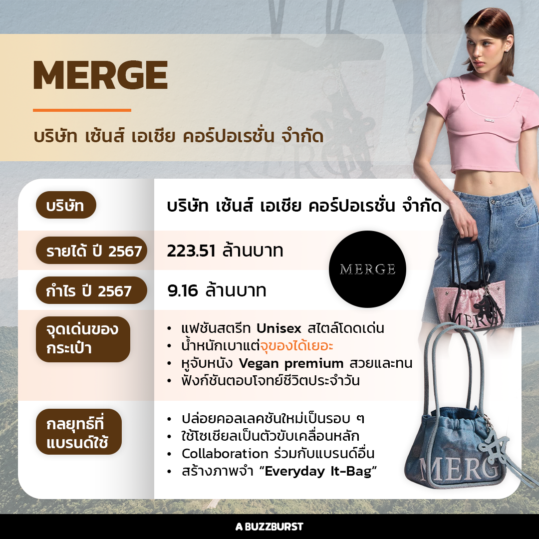 กวาดรายได้ 223.51 ล้านบาท และกำไร 9.16 ล้านบาท ในปี 2567 ที่ผ่านมา Merge ปักธงในฐานะกระเป๋าแฟชันสตรีท unisex ที่ตอบโจทย์การใช้งานจริง เน้นวัสดุเบาแต่จุเยอะ หูจับหนัง vegan พรีเมียม และฟังก์ชันครบถ้วน กลยุทธ์ของ Merge คือการปล่อยคอลเลกชันใหม่เป็นรอบๆ ใช้โซเชียลดันกระแส Collaboration กับแบรนด์อื่นๆ และสร้างภาพจำว่าใครๆ ก็ต้องมี Everyday It-Bag