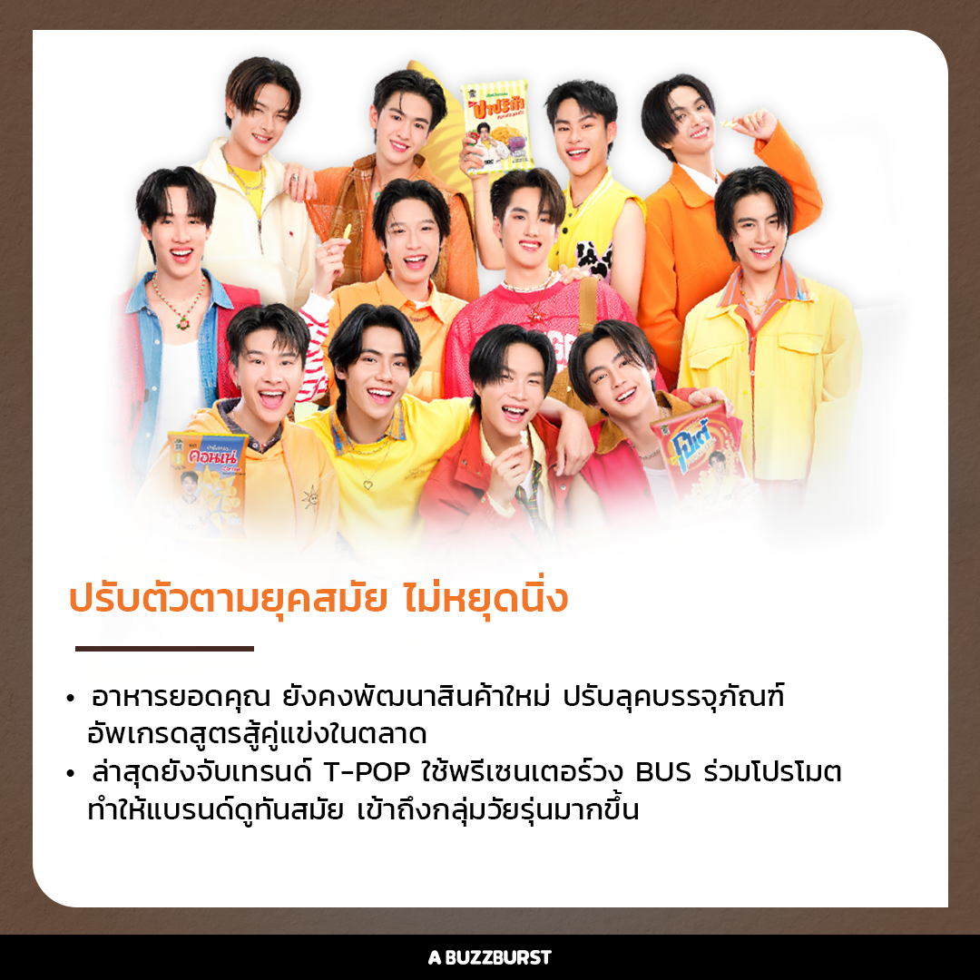แม้ตลาดขนมจะมีคู่แข่งใหม่ ๆ เข้ามาตลอด แต่อาหารยอดคุณก็ยังปรับตัวอย่างต่อเนื่อง ทั้งการอัปเดตลุคบรรจุภัณฑ์ให้ดูทันสมัย ปรับสูตรใหม่ ๆ และล่าสุดดึงวง BUS มาเป็นพรีเซ็นเตอร์ช่วยโปรโมต เพื่อให้แบรนด์ดูสดใหม่และเชื่อมต่อกับคนรุ่นใหม่ได้อยู่เสมอ
