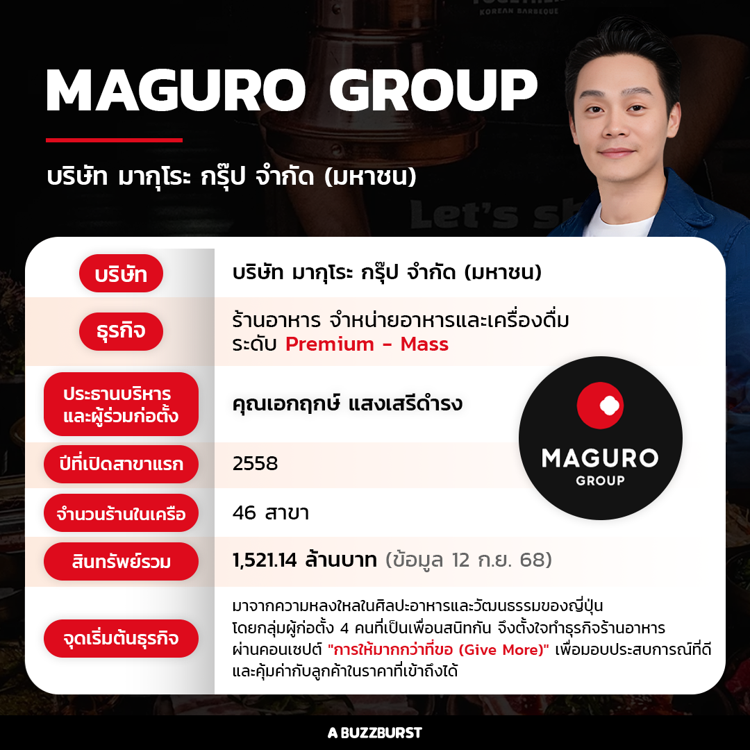 ปัจจุบัน MAGURO Group มีสาขาทั้งหมด 46 แห่ง และตั้งเป้าจะเพิ่มเป็น 52 แห่งภายในสิ้นปีนี้ โดยในปี 2567 ที่ผ่านมาบริษัทมีรายได้รวมกว่า 1,378.23 ล้านบาท และกำไรสุทธิ 96.64 ล้านบาท พร้อมตั้งเป้ารายได้ในปี 2568 นี้อยู่ที่ 2,000 ล้านบาท