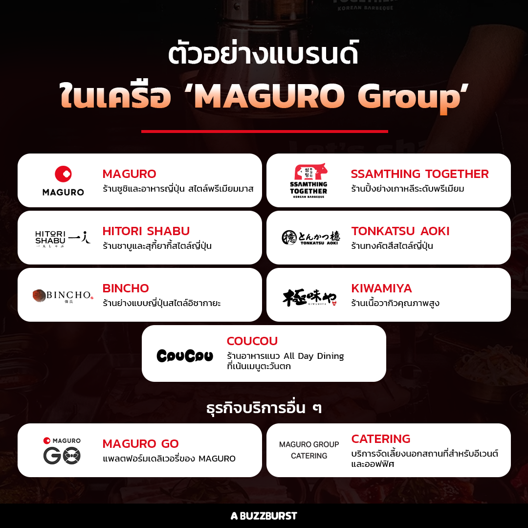 ปัจจุบัน MAGURO Group มีแบรนด์ในเครือทั้งหมด 6 แบรนด์ ได้แก่ MAGURO ร้านซูชิและอาหารญี่ปุ่นสไตล์พรีเมียมมาส, SSAMTHING TOGETHER ร้านปิ้งย่างเกาหลีระดับพรีเมียม, HITORI SHABU ร้านชาบูและสุกี้ยากี้สไตล์ญี่ปุ่น, TONKATSU AOKI ร้านทงคัตสึสไตล์ญี่ปุ่น, COUCOU ร้านอาหารแนว All Day Dining ที่เน้นเมนูตะวันตก, BINCHO ร้านย่างแบบญี่ปุ่นสไตล์อิซากายะ และ KIWAMIYA ร้านเนื้อวากิวคุณภาพสูง