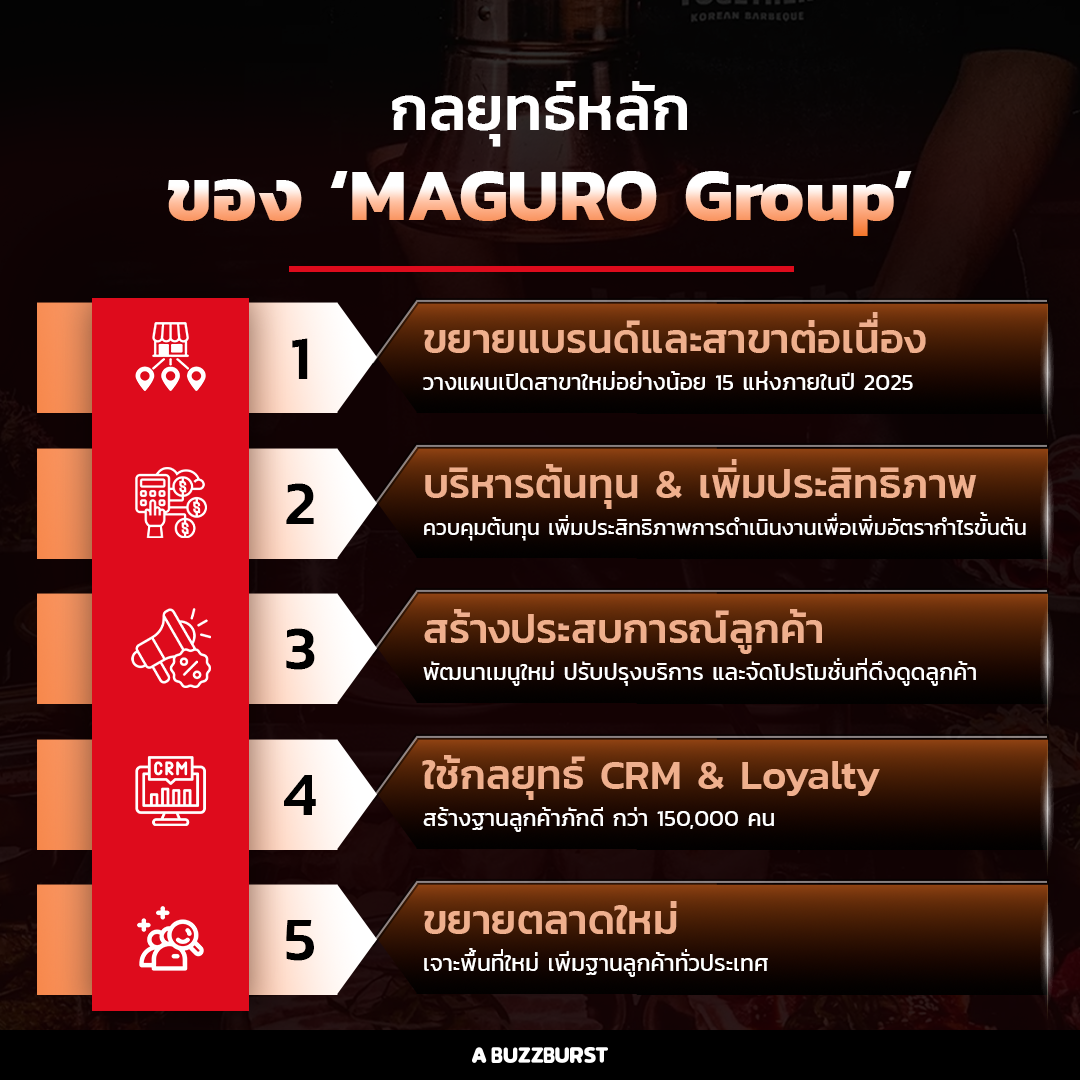 สำหรับกลยุทธ์หลักของ MAGURO Group คือการขยายธุรกิจอย่างรวดเร็วผ่านการเพิ่มแบรนด์ใหม่และสาขาใหม่ เพื่อเข้าถึงกลุ่มลูกค้าในหลากหลายระดับรายได้และตอบสนองความต้องการที่แตกต่างกันของผู้บริโภค